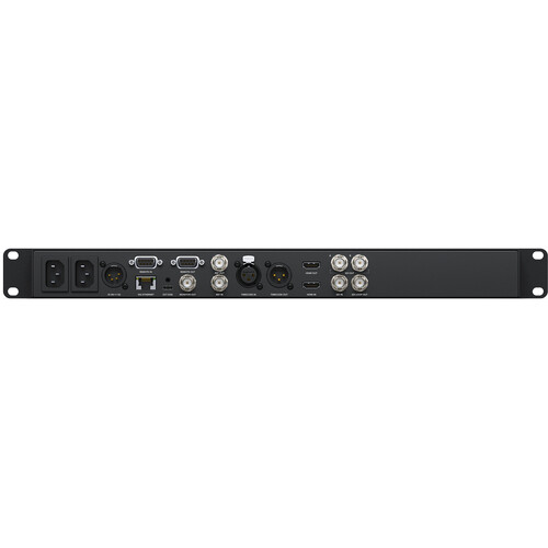 The Studio 4K Pro is a 1 RU rack-mountable unit, with built-in rack mount ears. It features illuminated front panel button control and a heavy jog/shuttle wheel for analog scrubbing. RS-422 control is supported for external control using the Ref input and output ports. The USB-C port allows you to record to external disks, and you can also use it to plug into a computer to use as a source for a web stream. An integrated LCD on the front panel allows you to monitor the video and display timecode and transport information.